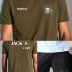 Echipamentul contine 2 piese vestimentare PERSONALIZATE, tricou kaki cu maneca scurta si pantalon scurt de culoare neagra, pe care sunt imprimate (Numele Brandului, Logo-ul Brandului si Nume Pescar).